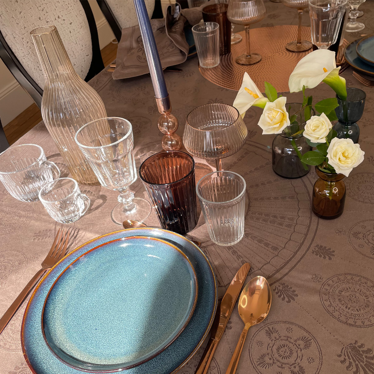 Le pack facile* + la décoration de la table comprenant 1 carafe, 1 centre de table cuivré 40cm, 3 vases colorés transparents et un bougeoir (pour une tablée de 2 à 8 personnes)